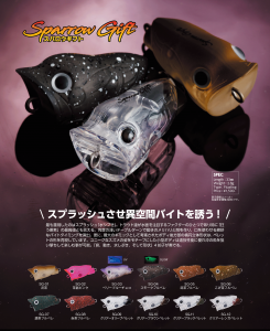 最も重視したのはスプラッシュ「水シブき」。トラウト達が水面を注目するファクターのひとつであり時に「狂う要素」の最高値とも言える。角度の浅いテーブルターンで動きのメリハリと間を作り口を使わせる絶妙なバイトタイミングを演出。更に、最大のギミックとして考案されたボディ後方部の楕円立体形状は、ペレットの形を再現しています。ユニークなスズメの姿をモチーフにした小型ボディは遠投性能に優れ沖の魚を狙い撃ちして楽しむ事が可能。「音、動き、水しぶき、そして形状」4拍子が奏でる
